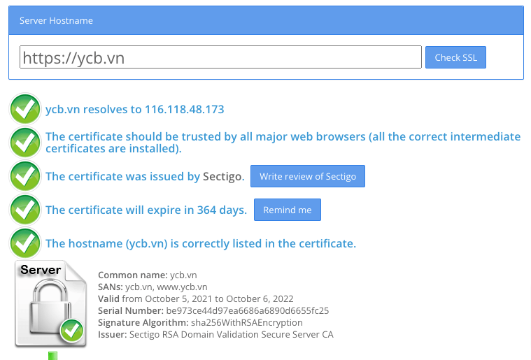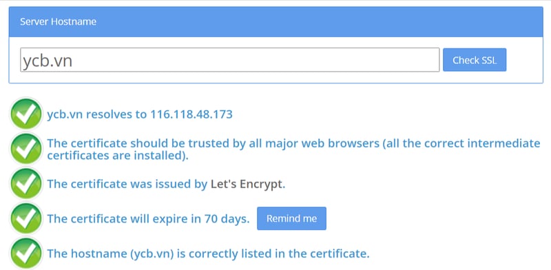 Bạn có thể kiểm tra chứng chỉ SSL của tên miền bằng website này: www.sslshopper.com