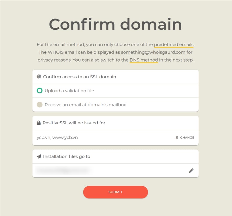 Ở bước đầu tiên, bạn chỉ cần bấm SUBMIT. Chúng ta sẽ thiết lập xác nhận bằng DNS ở bước sau.