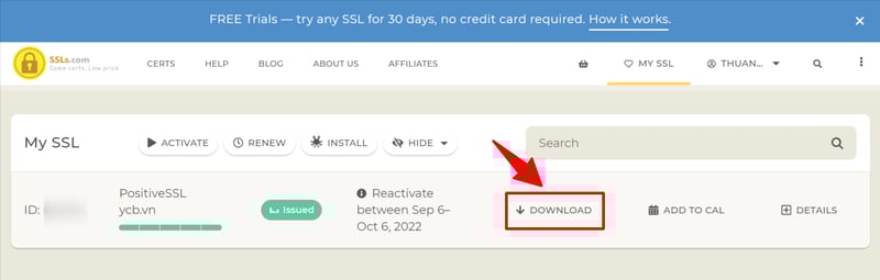 Bấm vào nút Download để tải chứng chỉ SSL về máy, chuẩn bị cho bước cấu hình SSL cho tên miền.