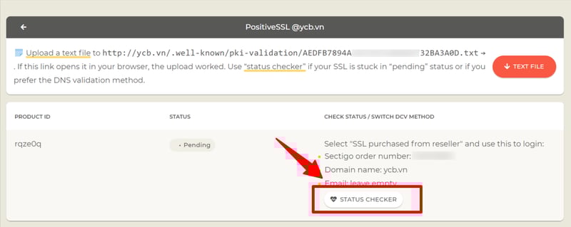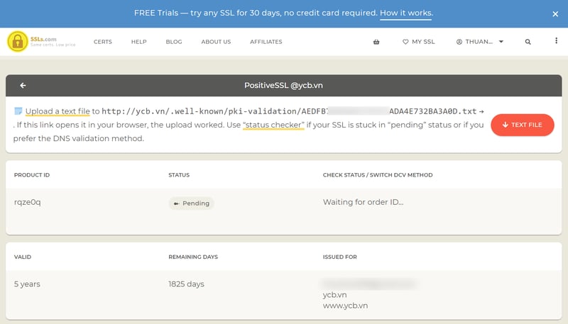 Ở bước này, SSLs.com yêu cầu upload file lên máy chủ của website để xác nhận qua file. Mình muốn xác nhận qua DNS nên sẽ truy cập vào trang quản lý My SSL để làm tiếp