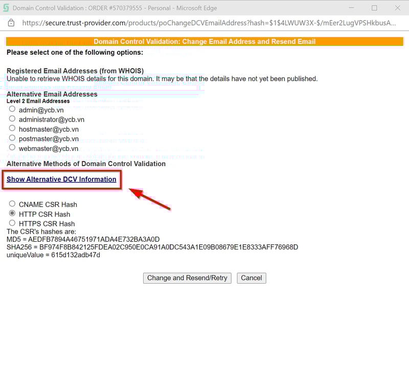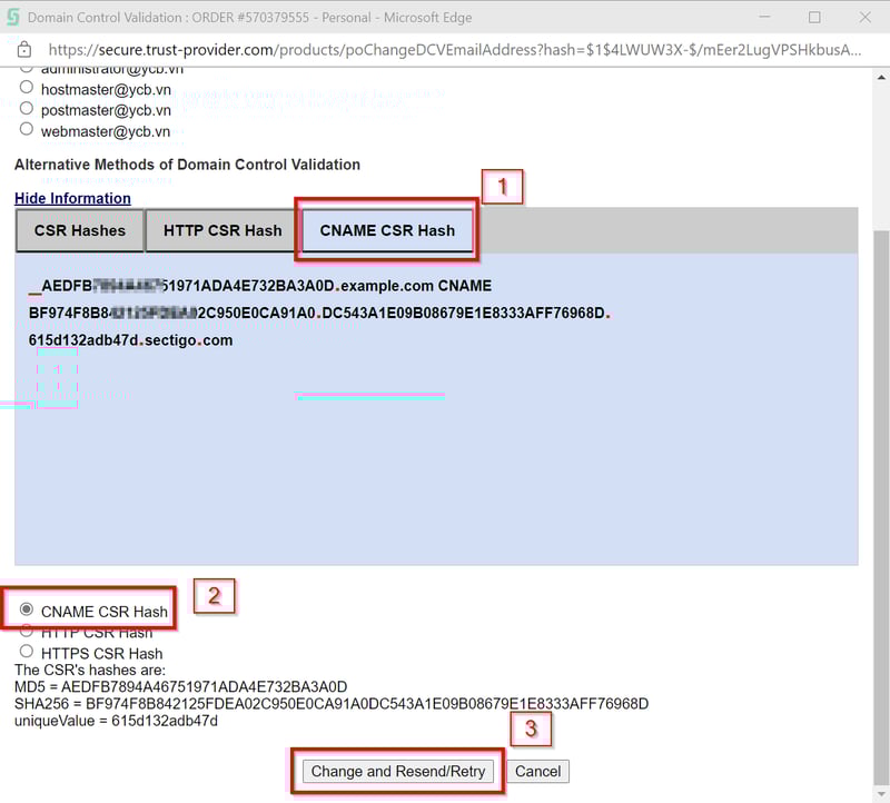 Chọn qua mục CNAME CRS Hash. Bạn sẽ thấy thông tin CNAME cần thiết lập trên DNS của tên miền. Chọn tiếp mục CNAME CSR Hash . Sau đó bấm Change and Resend / Retry