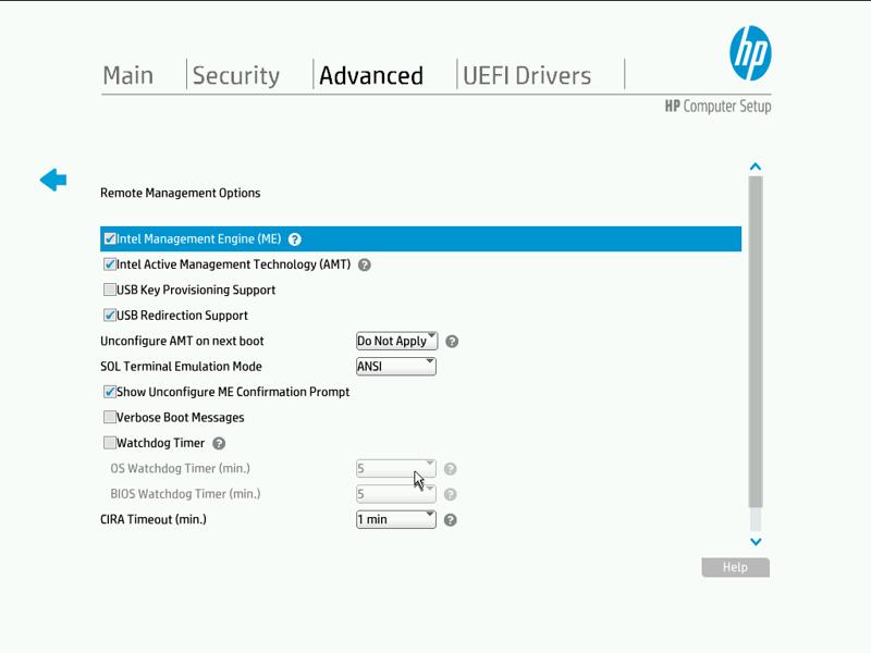 Dưới đây là màn hình kích hoạt AMT của UEFI trên máy tính HP 800 Mini G5.