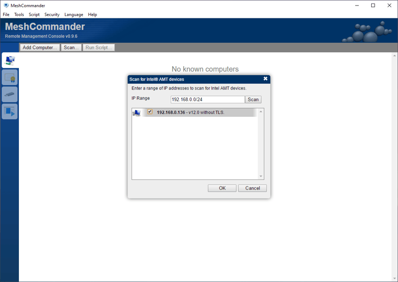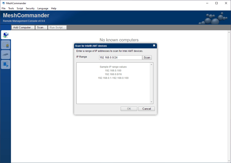 Mở MeshCommander, bấm vào Add Computer, nhập vào IP Range, bấm Scan