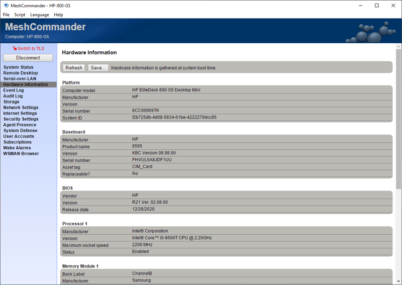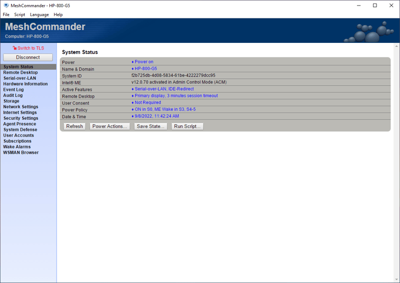 Sau khi kết nối thành công, màn hình sẽ hiển thị thông tin hệ thống của máy tính đang nằm dưới sự điều khiển của MeshCommander.