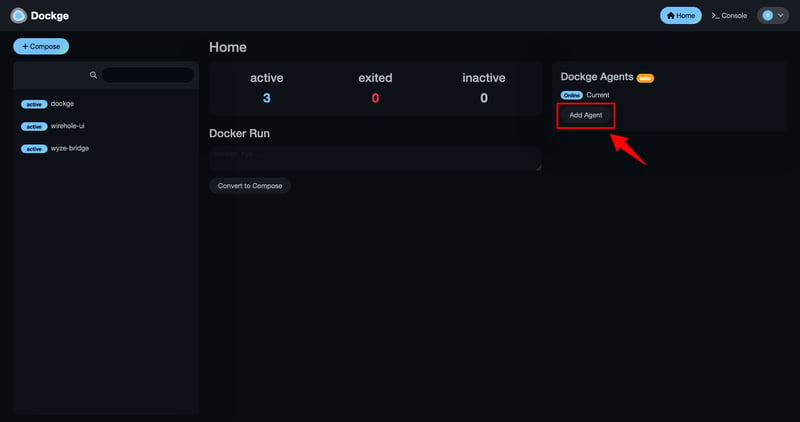Bấm vào nút Add Agent để kết nối tới máy chủ khác đã được cài Dockge.