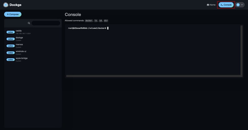 Dockge được tích hợp sẵn Web Terminal để quản lý Docker bằng dòng lệnh. Bấm vào nút Console ở góc trên bên phải để truy cập vào Console. Bạn có thể gõ lệnh vào khu vực Console hiện ra bên dưới.