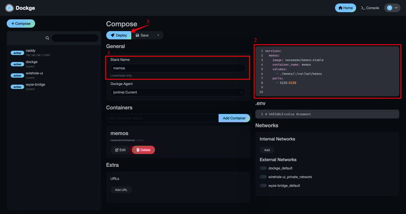 version: "3.8"services: dockge: image: louislam/dockge:1 restart: unless-stopped ports: - 5001:5001 volumes: - /var/run/docker.sock:/var/run/docker.sock - ./data:/app/data # Stacks Directory # READ IT CAREFULLY. If you did it wrong, your data could end up writing into a WRONG PATH. # 1. FULL path only. No relative path (MUST) # 2. Left Stacks Path === Right Stacks Path (MUST) - /home:/home environment: # Tell Dockge where to find the stacks - DOCKGE_STACKS_DIR=/homeKích hoạt Dockge