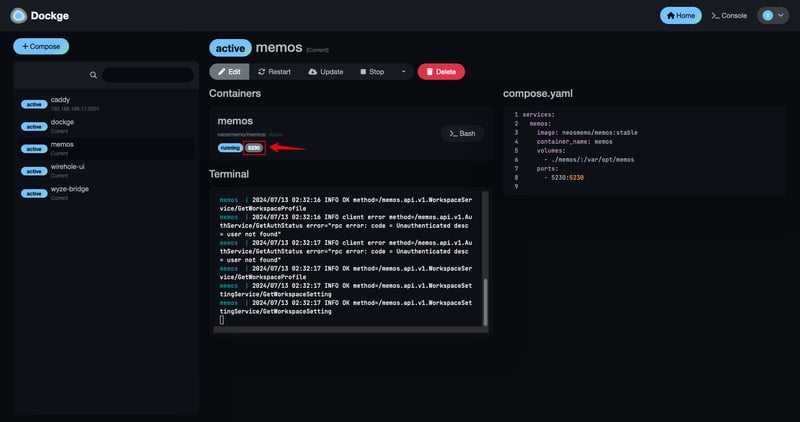 Sau khi Dockge hoàn thành việc kích hoạt ứng dụng mới, bạn có thể bấm vào số port để truy cập vào ứng dụng.