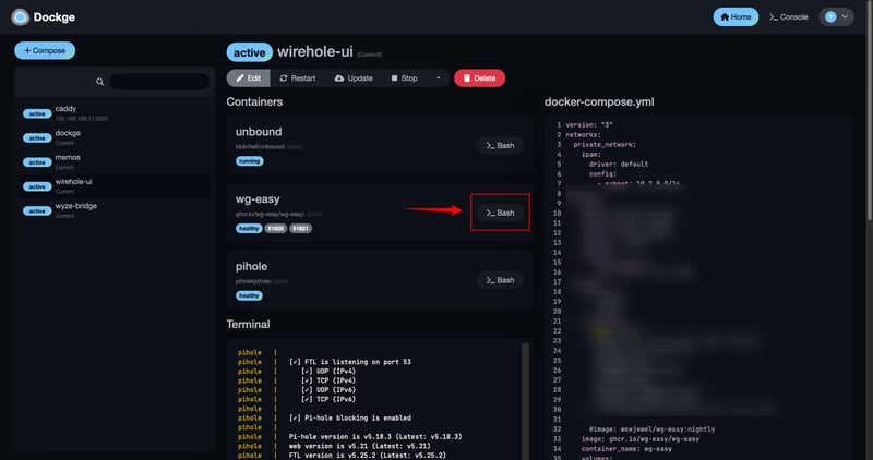 Bạn cũng có thể truy cập vào Terminal của từng container bằng cách bấm vào nút >_Bash