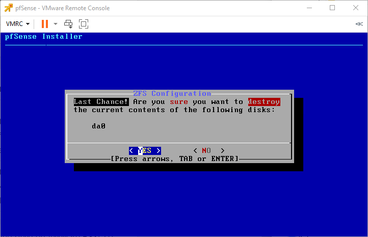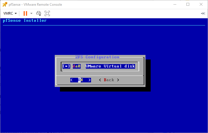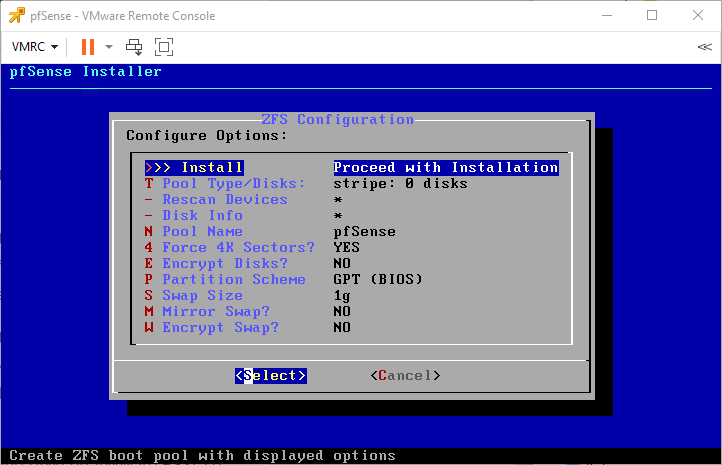 Bấm Select để xác nhận việc cài đặt pfSense lên ổ cứng của máy ảo.