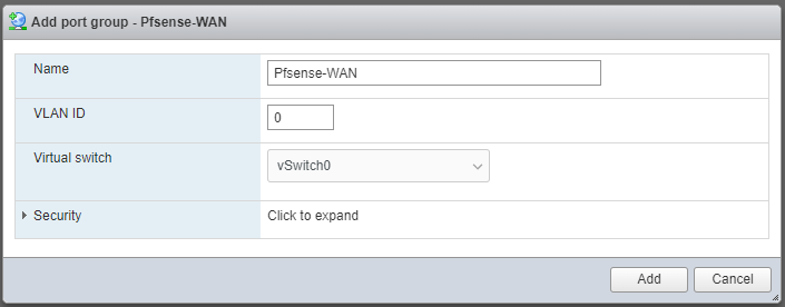 Port group đầu tiên tên pfSense-WAN, và kết nối vào vSwitch0. Port group này sẽ được dùng để kết nối vào cổng WAN của máy ảo pfSense.