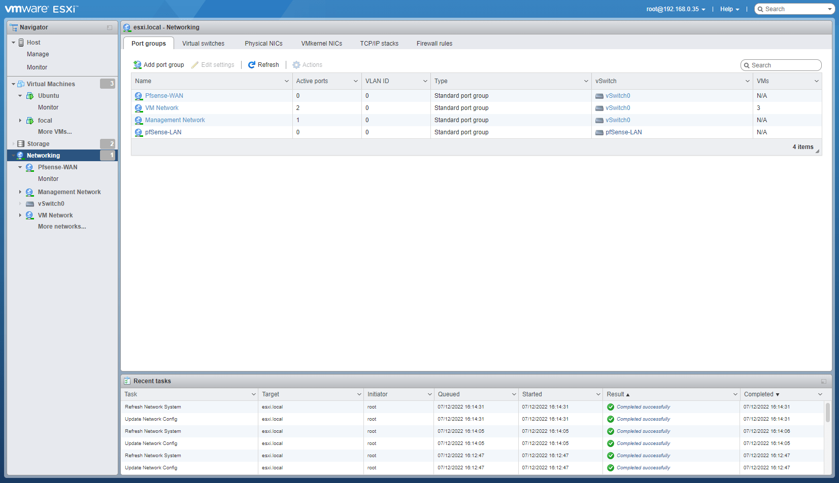 Sau khi tạo xong, mục port group sẽ có hiện ra 4 cái: VM Network và Management Network là mặc định của ESXi. Còn pfSense-LAN và pfSense-WAN vừa mới tạo.