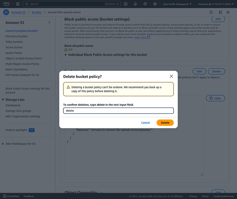 Đồng thời, minh sẽ vào Amazon S3, xóa policy của bucket upload để nó về lại chế độ private.