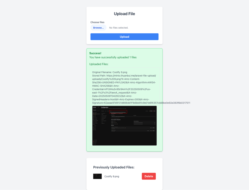 MINIO_KEY=VFfxxxxxxxxr9AmMINIO_SECRET=EEHetgd5xxxxxxxxxxWMrMINIO_BUCKET=laravel-file-uploadMINIO_ENDPOINT=https://minio.thuanbui.meMINIO_USE_SSL=true3. Upload file lên Minio