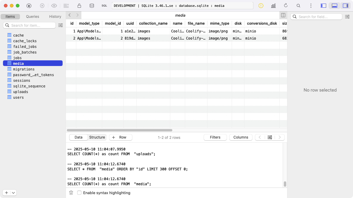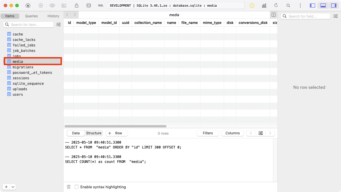 php artisan migrateDatabase sẽ có thêm 1 table với tên gọi media, lưu các thông tin về file được upload.