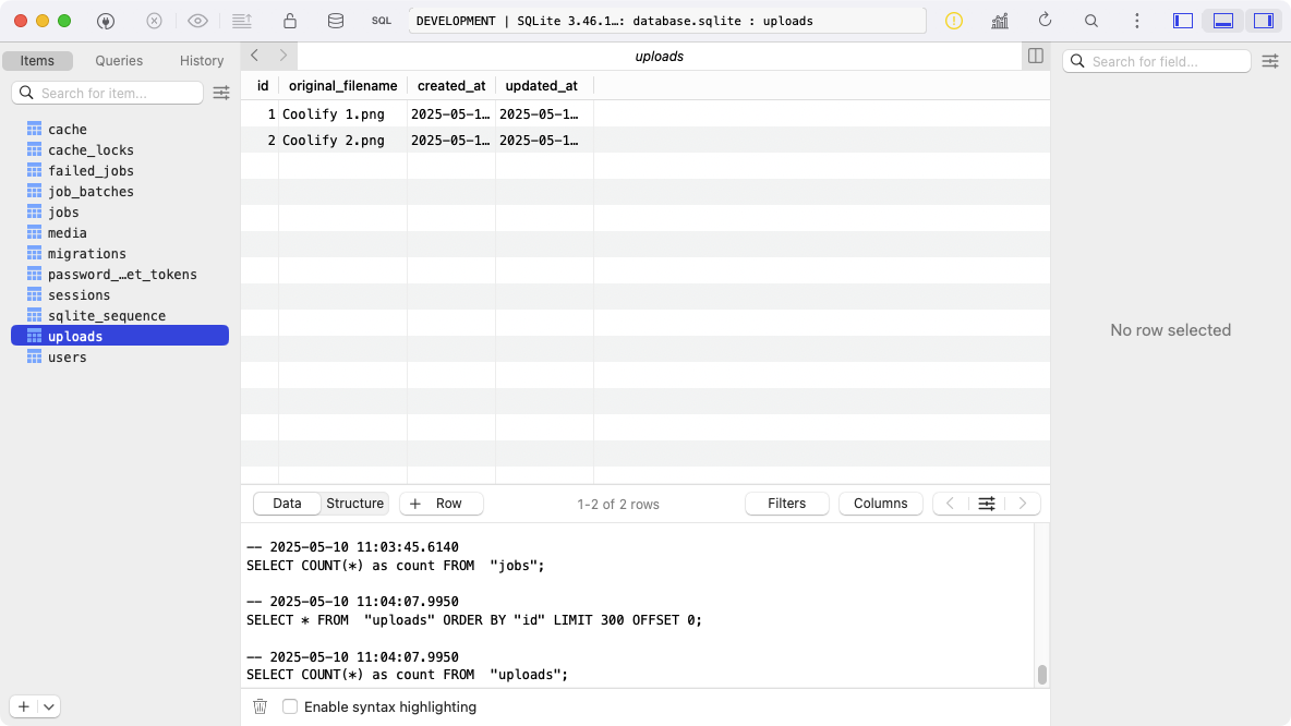 Kiểm tra database, table uploads có thêm 2 mục mới