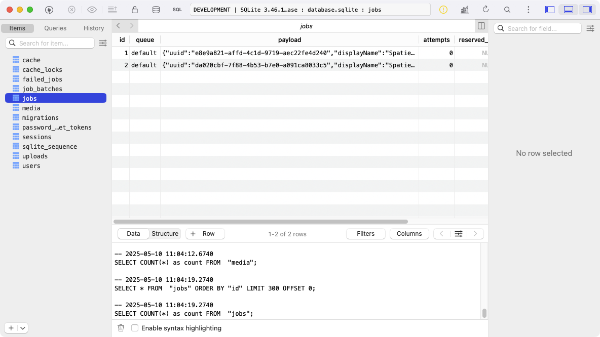 Mặc địch, các thao tác xử lý ảnh sẽ được xếp vào queue (hàng đợi). Chúng ta có thể kiểm tra trong table jobs, sẽ thấy 2 jobs đang đợi