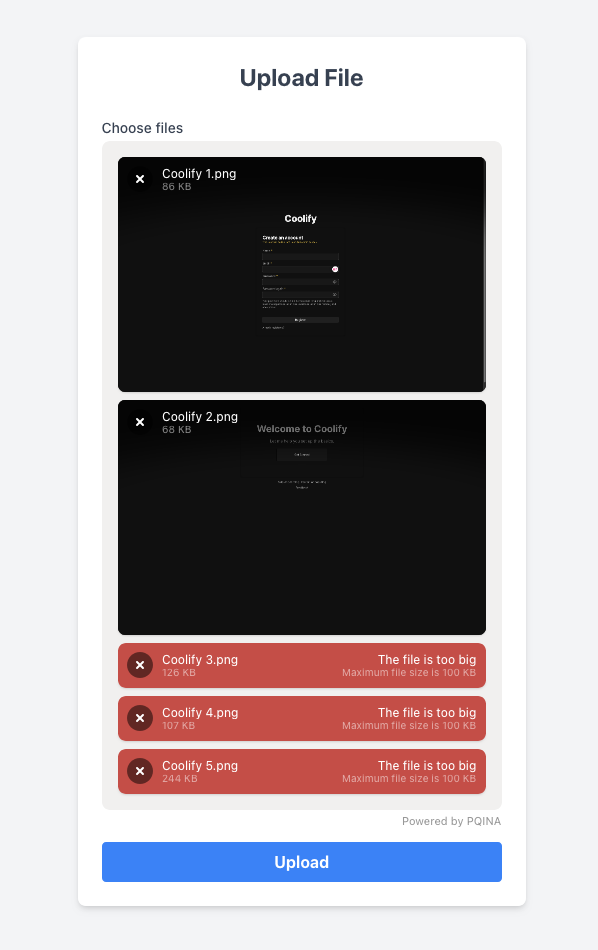 Trong trường hợp chọn file, ảnh file thỏa mãn điều kiện nhỏ hơn 100KB sẽ tự động hiển thị ảnh thumbnail, các file quá lớn sẽ bị từ chối cùng với lỗi The file is too big.