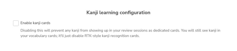 Mặc định, jpdb.io sẽ hiển thị thêm phần dạy nét Kanji cho từng từ vựng trong danh sách học. Việc này sẽ khiến việc học từ vựng trở nên quá khó, quá mất thời gian, dễ khiến người mới học nản chí. Do đó, tốt nhất nên tắt chức năng này đi: Truy cập vào mục Settings, tìm mục Enable kanji cards và bỏ chọn. Sau đó lưu lại.