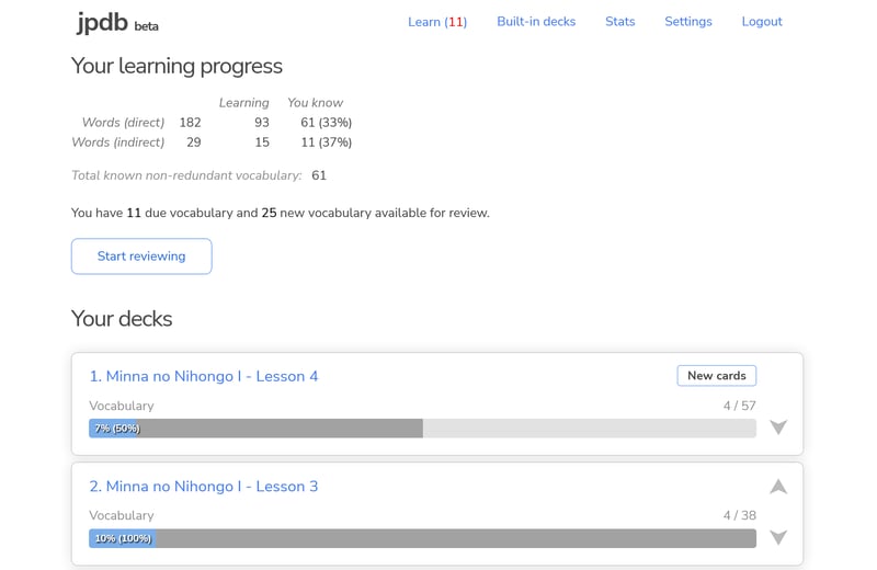 Mỗi bài học trong sách Minna No Nihongo có khoảng 40-50 từ vựng mới. Để giúp học từ vựng hiệu quả, mình sử dụng website jpdb.io (miễn phí).