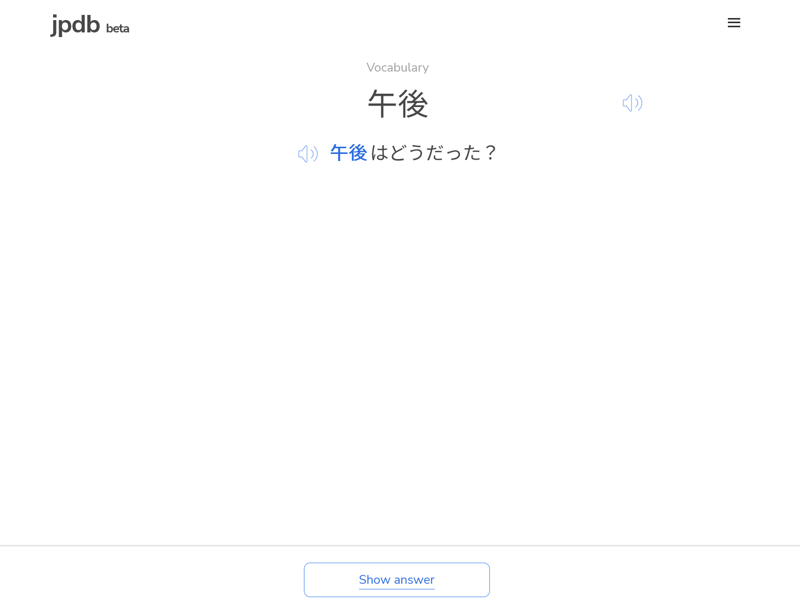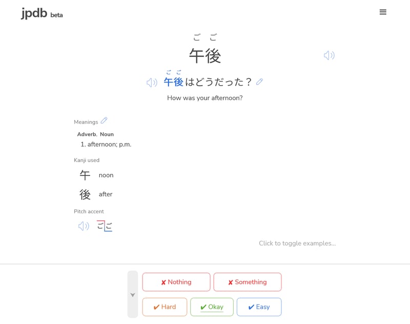 Dưới đây là giao diện học từ vựng của jpdb.io. Với các từ mới, nó sẽ hiện ra từ bằng tiếng Nhật kèm theo giải thích nghĩa, phát âm và ví dụ bằng tiếng Anh.