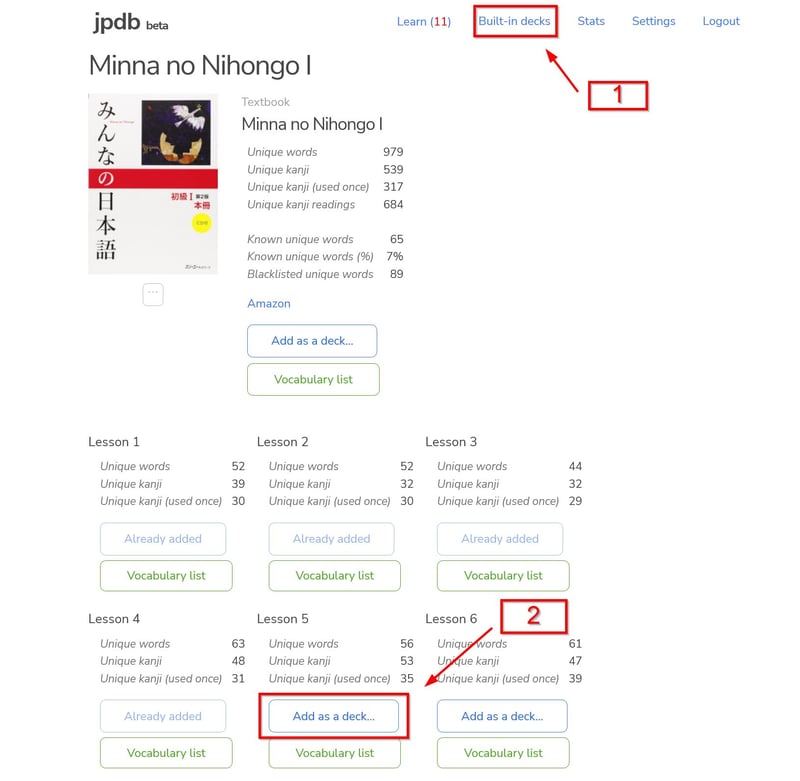 Sau khi đăng ký tài khoản, truy cập vào mục Built-in decks, tìm sách Minna no Nihongo I, sau đó chọn Lesson tương ứng và bấm Add as a deck… để thêm từ vựng vào danh sách cần học.