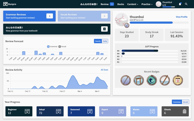 Từ khoảng cuối tháng 2, mình bắt đầu sử dụng thêm website Bunpro.jp để ôn luyện ngữ pháp tiếng Nhật. Trang này chuyên dành để học ngữ pháp, đồng thời có luôn tính năng SRS để giúp ghi nhớ lâu hơn.