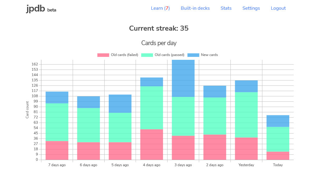 Phần từ vựng, mình học trên JPDB.io. Hiện tại đã học được 35 ngày liên tục.