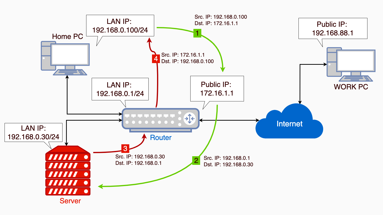 Chi tiết về DNAT / Hairpin NAT mình đã giải thích trong bài viết cũ, mọi người có thể tham khảo lại ở đó. Dưới đây mình sẽ tóm tắt nhanh về việc tại sao cần thiết lập Hairpin NAT trên Rrouter.