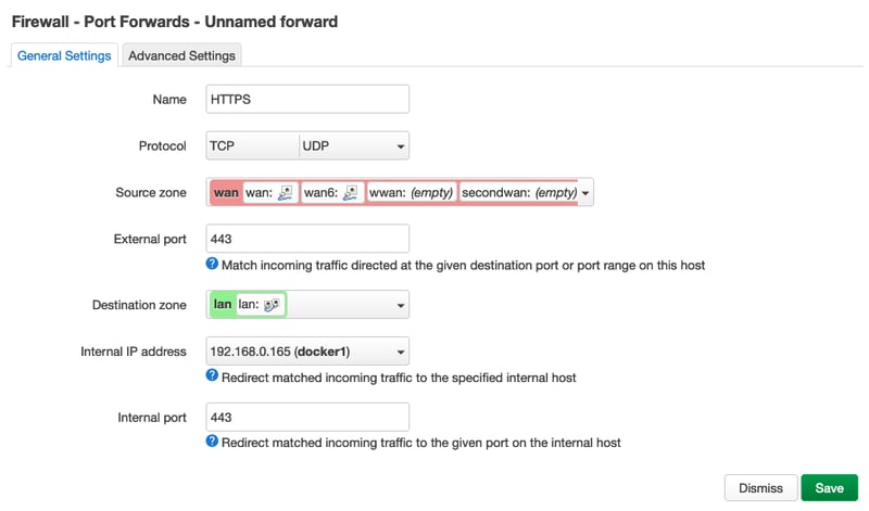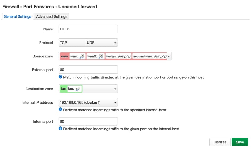 config redirect option dest 'lan' option target 'DNAT' option name 'HTTP' option src 'wan' option src_dport '80' option dest_ip '192.168.0.165' option dest_port '80'