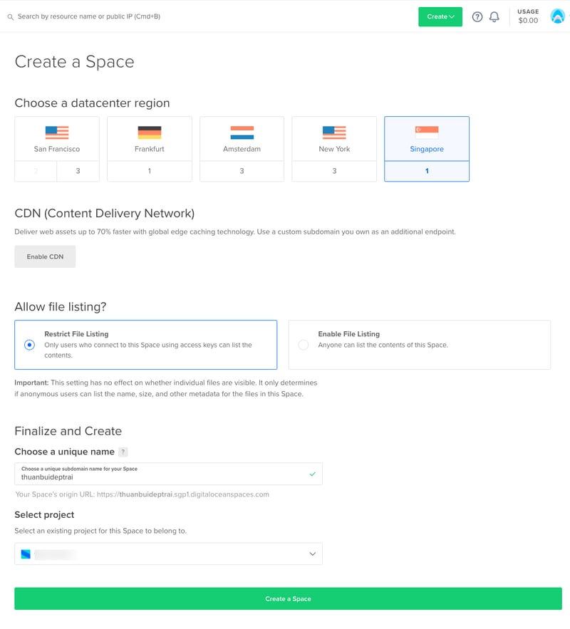 Choose a unique name: Chọn tên cho Spaces, không được trùng với tên có sẵn.