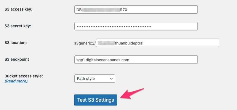 Sau khi đã có đủ thông số, điền vào UpdraftPlus và bấm Test S3 Settings. Mục Bucket access style: giữ nguyên Path style