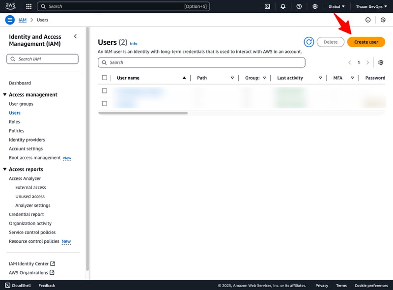 Truy cập vào mục Users, Bấm vào nút Create User để tạo tài khoản mới