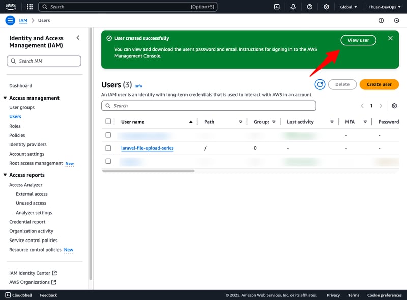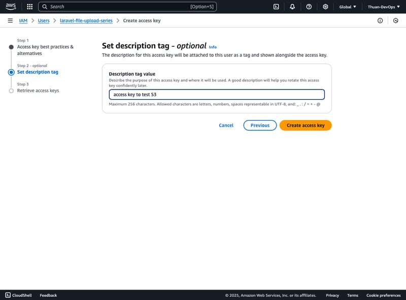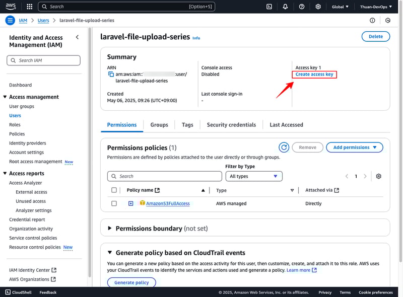 Tạo Access Key và Secret Key để các ứng dụng (như Laravel) có thể kết nối đến Amazon S3 qua API