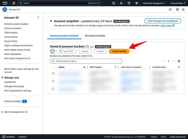 AWS Access Key ID [None]: A*****************4AWS Secret Access Key [None]: X**************************rDefault region name [None]: ap-southeast-1Default output format [None]:Xem danh sách S3 bucket