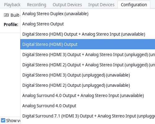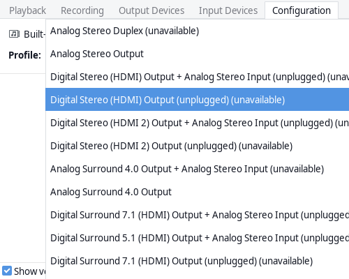 Truy cập vào phần Configurate của PulseAudio Volume Control thì thấy thông báo Digital Stereo (HDMI) Output (unplugged) (unvailable). Mình thử cắm qua các cổng DisplayPort khác trên máy nhưng cũng không có gì thay đổi.