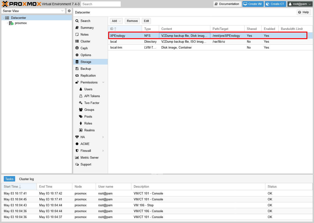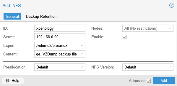 NFS Storage có tên XPEnology đã được thêm thành công vào Proxmox.