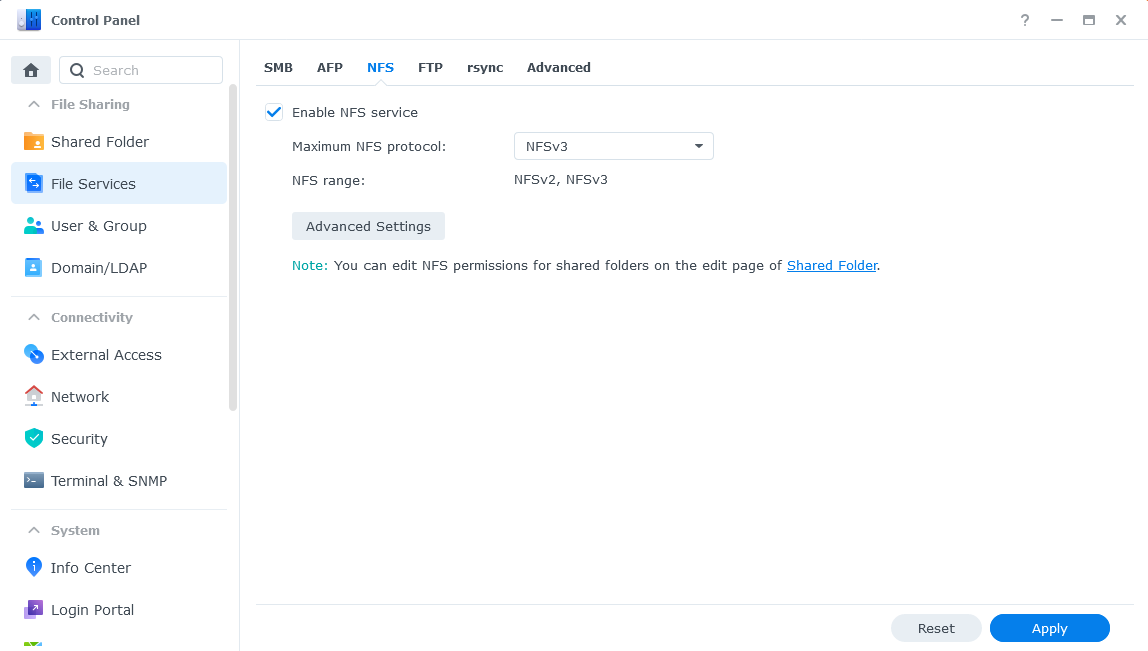 1. Kích hoạt NFS Service trên DSM Synology