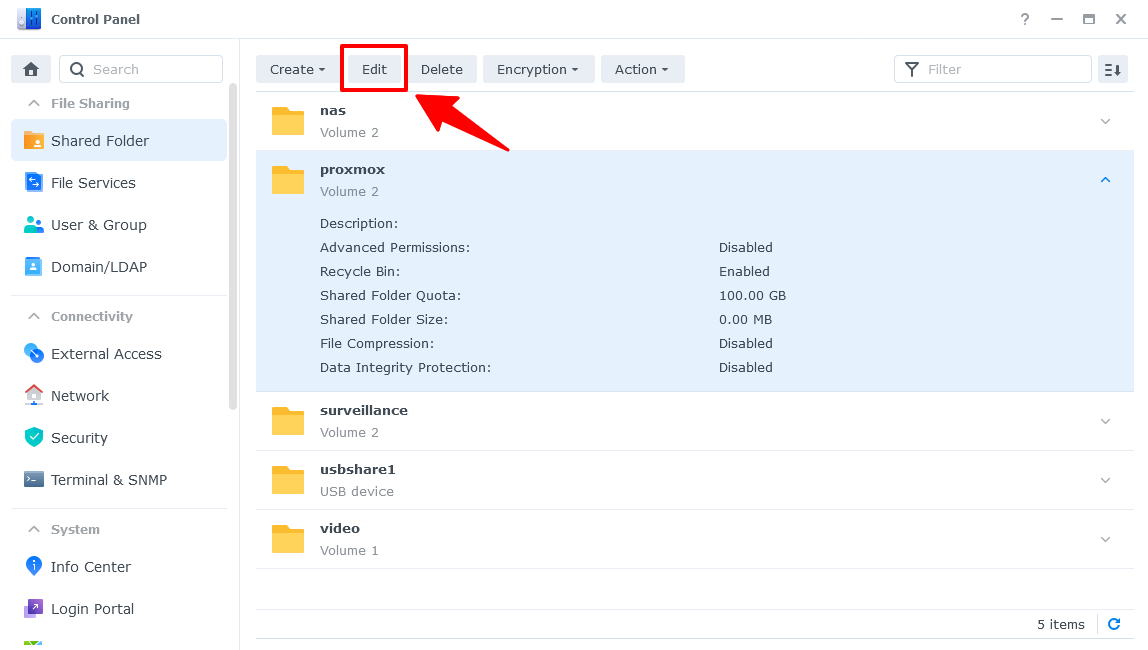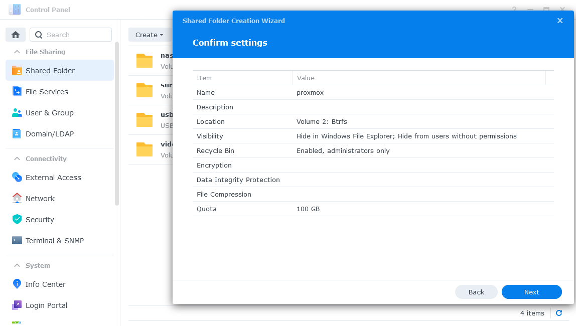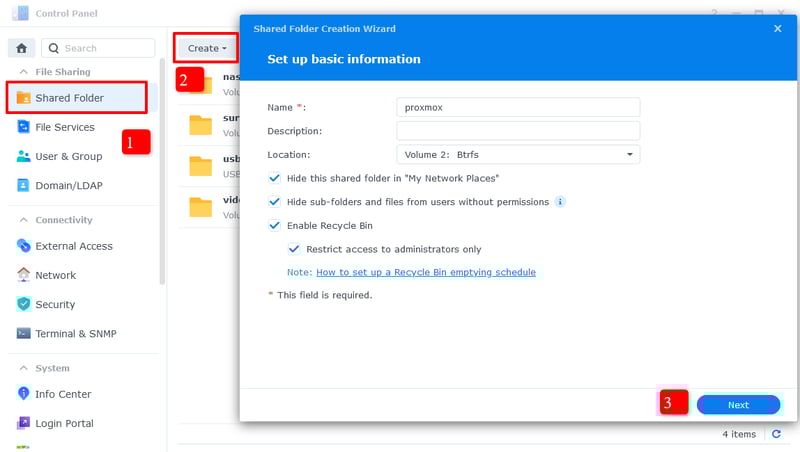 Truy cập vào mục Shared Folder, bấm vào Create -> Create Shared Folder để thư mục mới dành riêng cho Proxmox.
