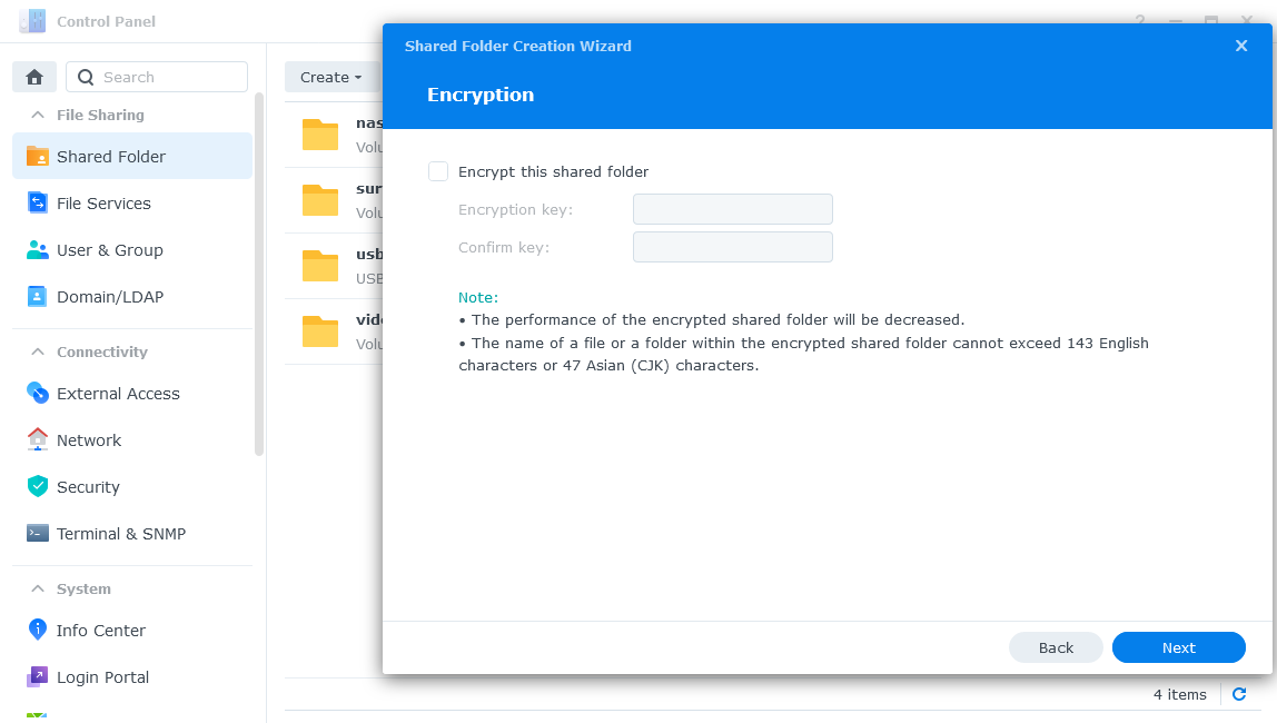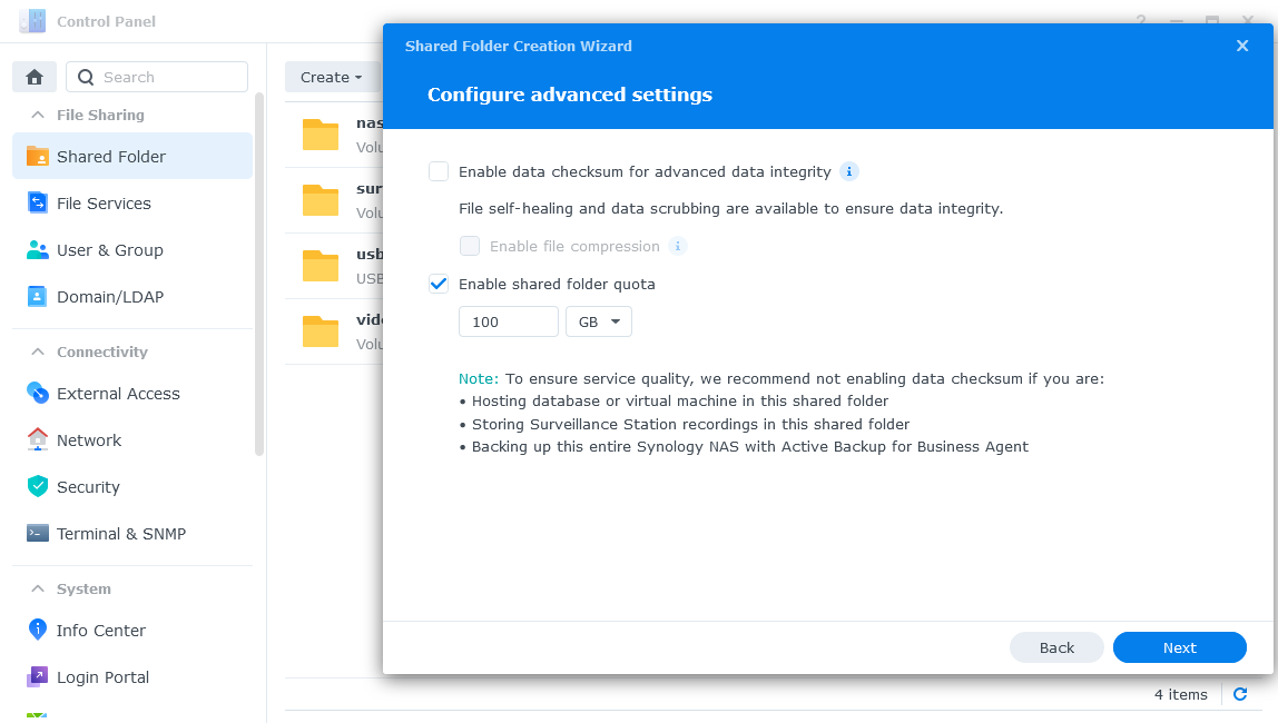 Bấm vào mục Enbale shared folder quota nếu bạn muốn giới hạn kích thước lưu trữ. Sau đó bấm Next.