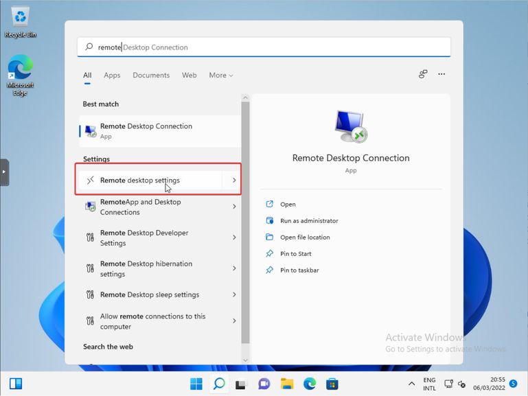 Bấm vào Start Menu, gõ Remote, sau đó chọn Remote desktop settings