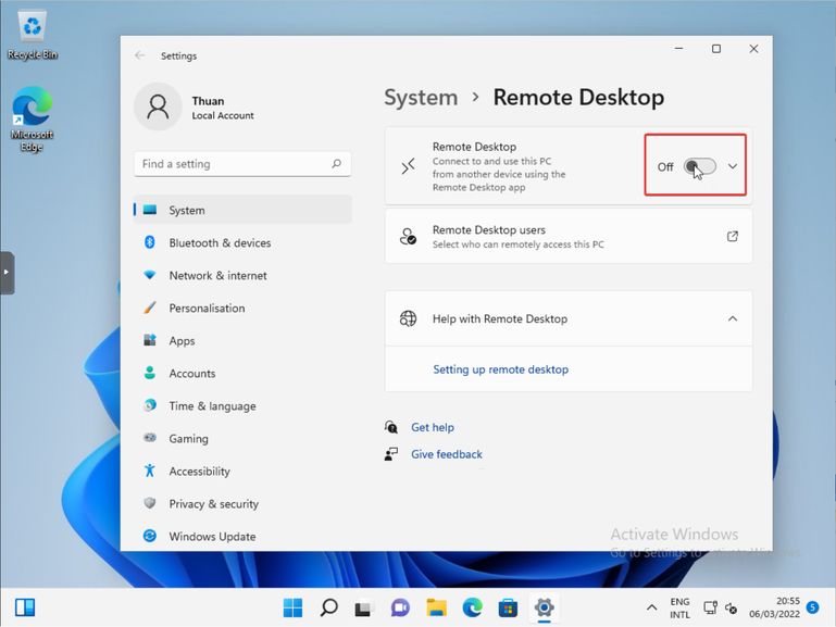 Bấm kích hoạt từ Off thành On ở mục Remote Desktop