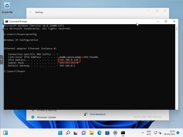 Tiếp theo, mình mở cmd, gõ lệnh ipconfig để tìm IP Address của máy ảo: 192.168.0.138. Đây là địa chỉ IP Address mình sẽ dùng dể kết nối từ xa vào máy ảo này.