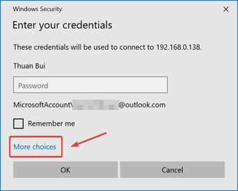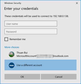 Chọn Use a different account, sau đó ở trên nhập vào User name và Password tương ứng.