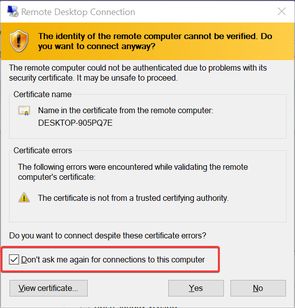 Hệ thống sẽ hiện ra cảnh báo Certificate error, cái này không sao cả. Bấm chọn Don’t ask me… để nó khỏi hiện ra nữa. Bấm Yes để tiếp tục