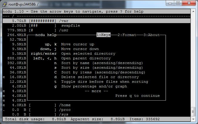 Để xem chi tiết các lệnh điều khiển của NCDU, bấm nút Shift + ?