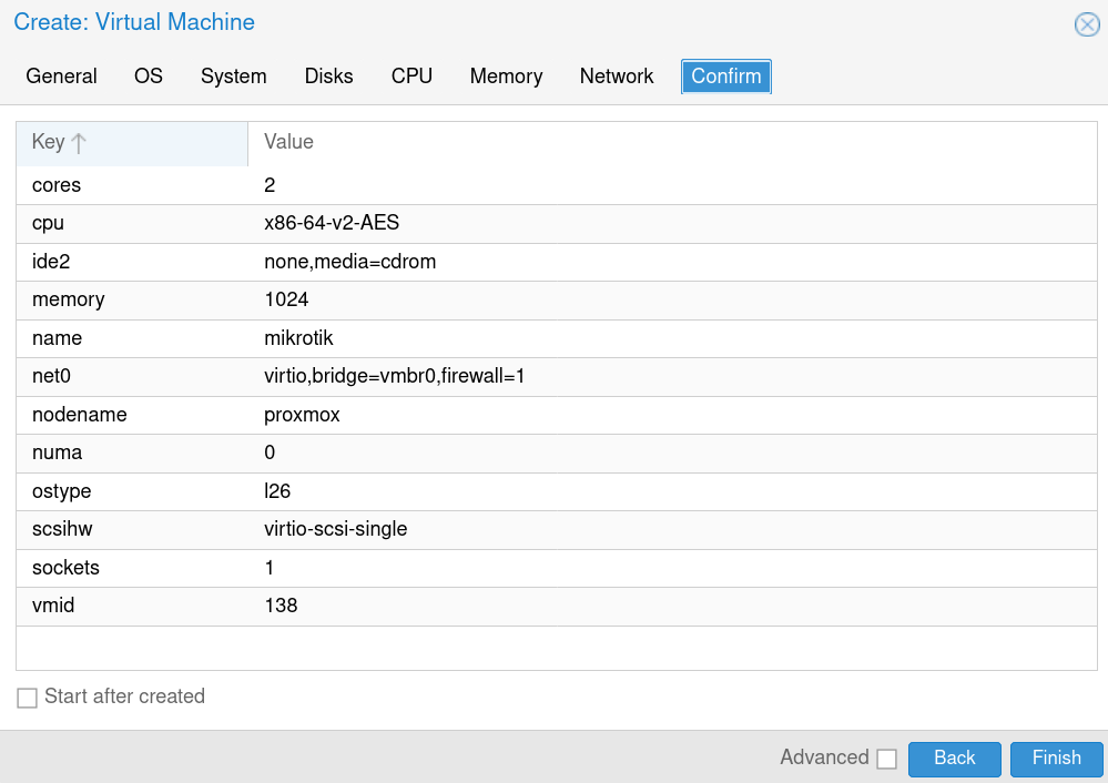 Tạo máy ảo mới để chạy CHR theo cấu hình tương tự dưới đây. Không cần phải tạo ổ cứng ảo mới vì chúng ta sẽ sử dụng file img vừa tải trước đó làm ổ cứng.