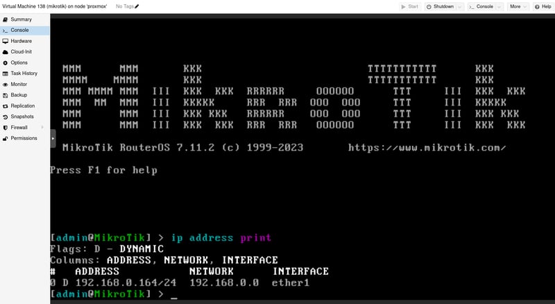 Bấm Start trên giao diện Proxmox để khởi động máy ảo CHR. Chờ vài giây, bạn cần đăng nhập bằng thông tin sau