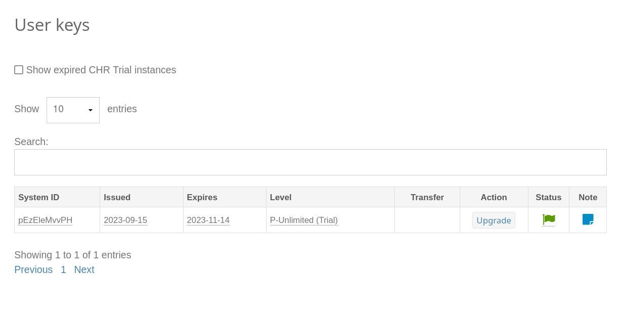 Ngoài ra khi đăng nhập vào website Mikrotik.com, bạn cũng sẽ thấy thông tin của máy ảo CHR vừa được kích hoạt.