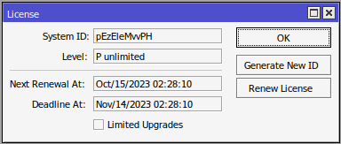Mặc định sau khi cài đặt, máy ảo sử dụng bản quyền Free (bị giới hạn tốc độ 1Mbps). Mikrotik cho phép dùng thử các gói bản quyền cao cấp hơn trong vòng 60 ngày.
